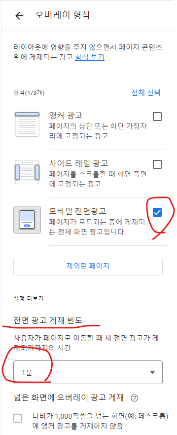 - 아래 전면 광고 게재 빈도에서 시간 설정