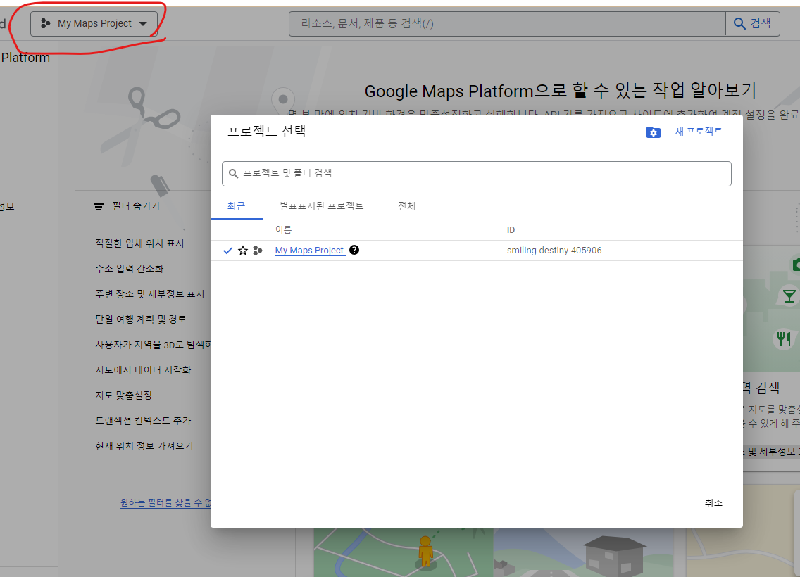 2. 죄측 상단에 "My Maps Project"를 눌러서 신규 프로젝스트를 생성합니다.
