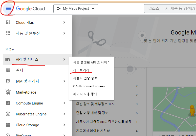 좌측 햄버거 메뉴 클릭 > API 및 서비스 > 라이브러리 이동