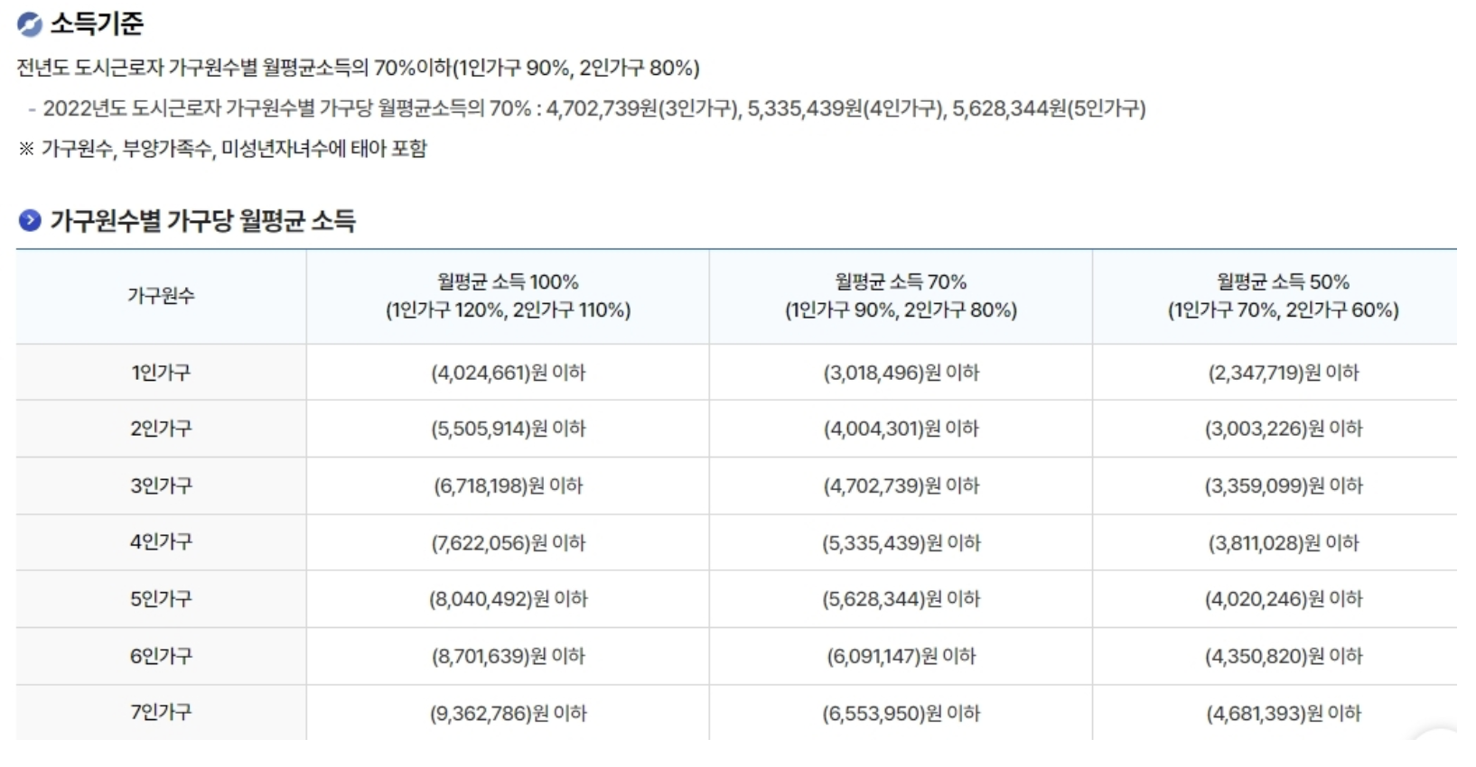 - 4인 가구 소득 기준 70%, 5,335,439원 이하